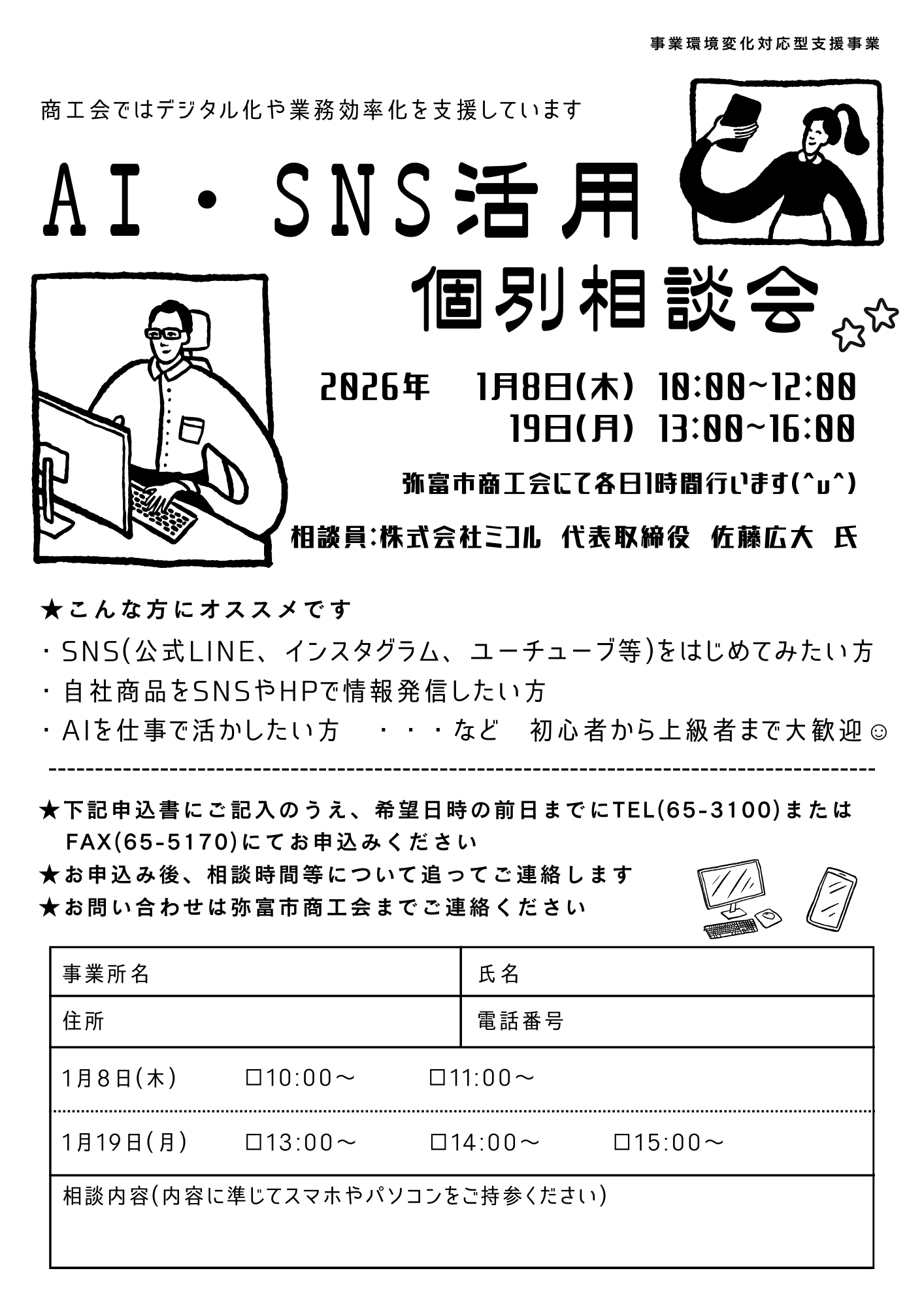 デジタル化や業務効率化支援のために、AI・SNS活用に関する個別相談会を開催します。